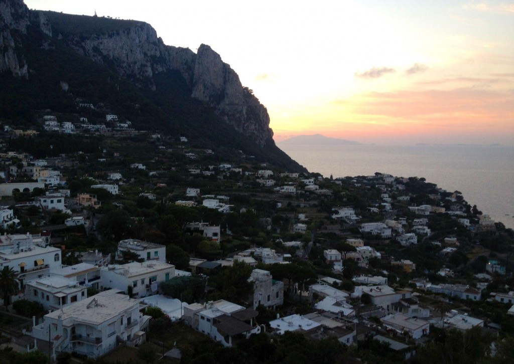 Das Foto zeigt die immergrüne Vegetation, geprägt von Terrassenkulturen aus Wein-, Öl- und Obstbäumen auf der Insel Capri. Haupterwerbszweig ist seit dem 19. Jahrhundert der ganzjährige Fremdenverkehr. Die Insel liegt nur rund fünf Kilometer vom Festland entfernt und gehört zur Provinz Neapel.