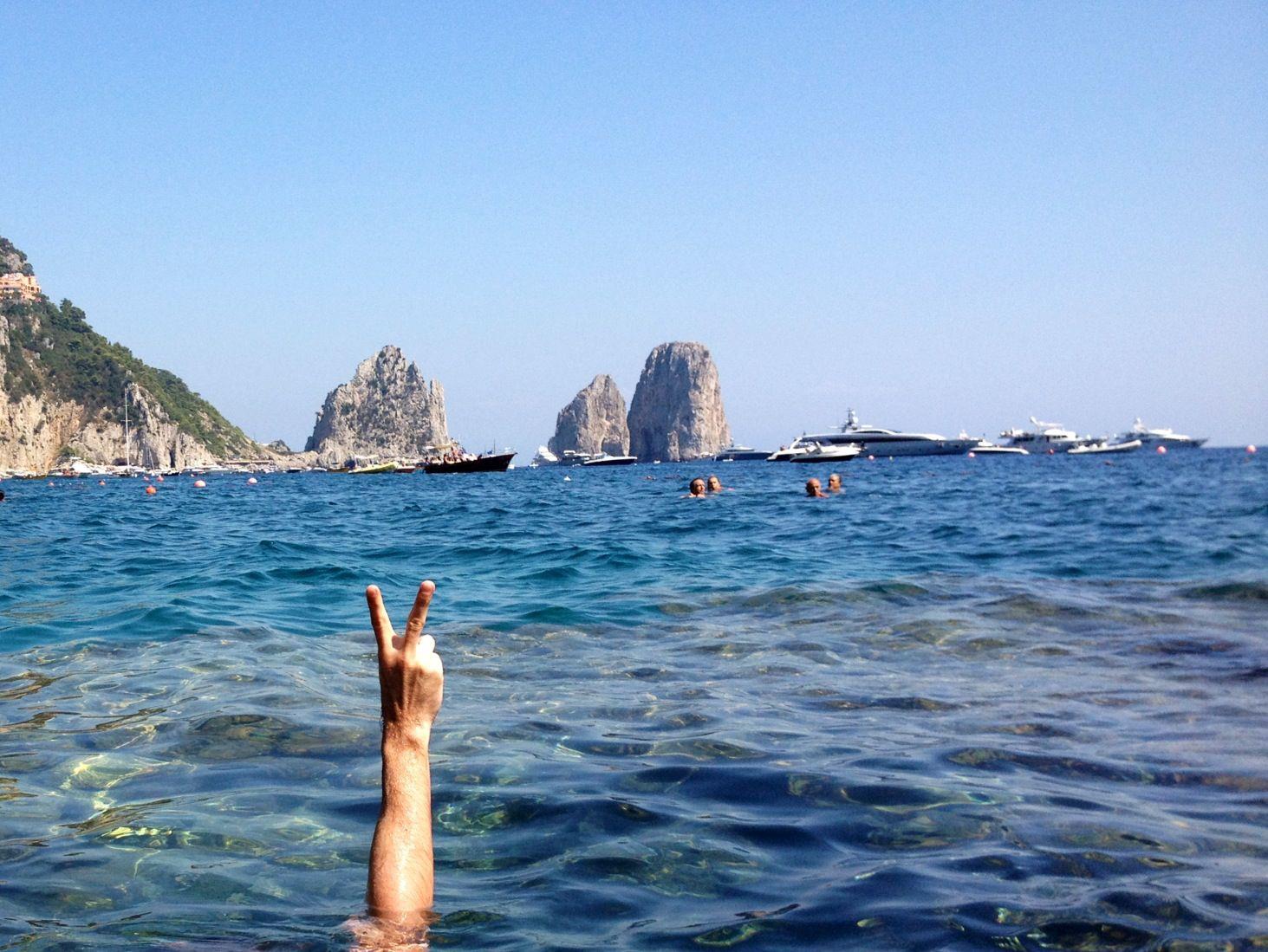 Das Foto zeigt die italienische Felseninsel Capri im Golf von Neapel. Sie ist 10,4 km² groß und bekannt für die Höhlen am Meer. Hier versuchte ich die Wasserthematik erneut aufzugreifen und grüßte die Menschheit aus einer neuen Perspektive. Nach schlappen 100 Versuchen stand das Bild.