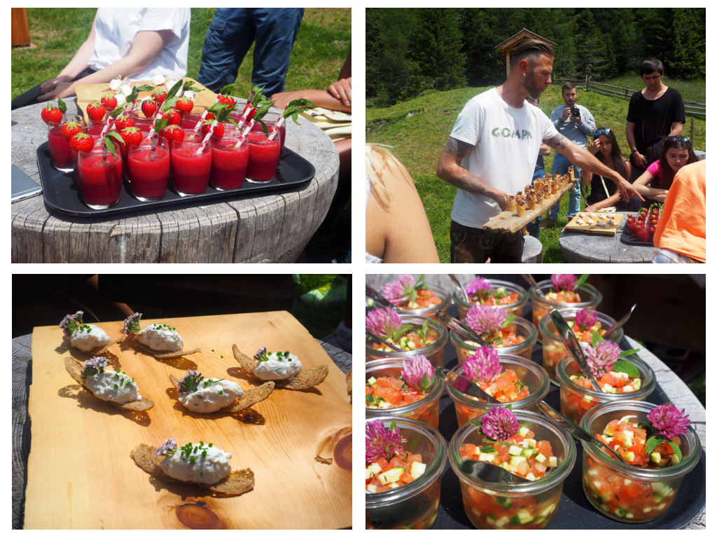 Im atemberaubend schönen Bergpanorama begrüßte uns Helli, der charismatische Wirt der Gompm Alm mit seinem treuen Berner Sennenhund. Während wir auf den Designer-Loungemöbeln die Blicke in die Ferne schweifen lassen und die klare Bergluft einatmen, kommt Helli mit einer ersten Stärkung zu uns. Er serviert Holunder- und Himbeer-Spritzer (hier nennt man Schorle gespritztes Wasser), Rote-Beete-Erdbeer-Smoothies, Schüttelbrot-Chips (Schüttelbrot ist eine Südtiroler Spezialität, ein getrocknetes Fladenbrot mit Kümmel, Anis und Fenchel) mit Frischkäse oder feinstes Tartar in Blätterteig-Hörnchen. Eine so raffinierte, aber dennoch traditionelle Küche hätte ich von einer Alm nicht erwartet – aber nicht umsonst in die Gompm Alm eine Gourmet-Alm!