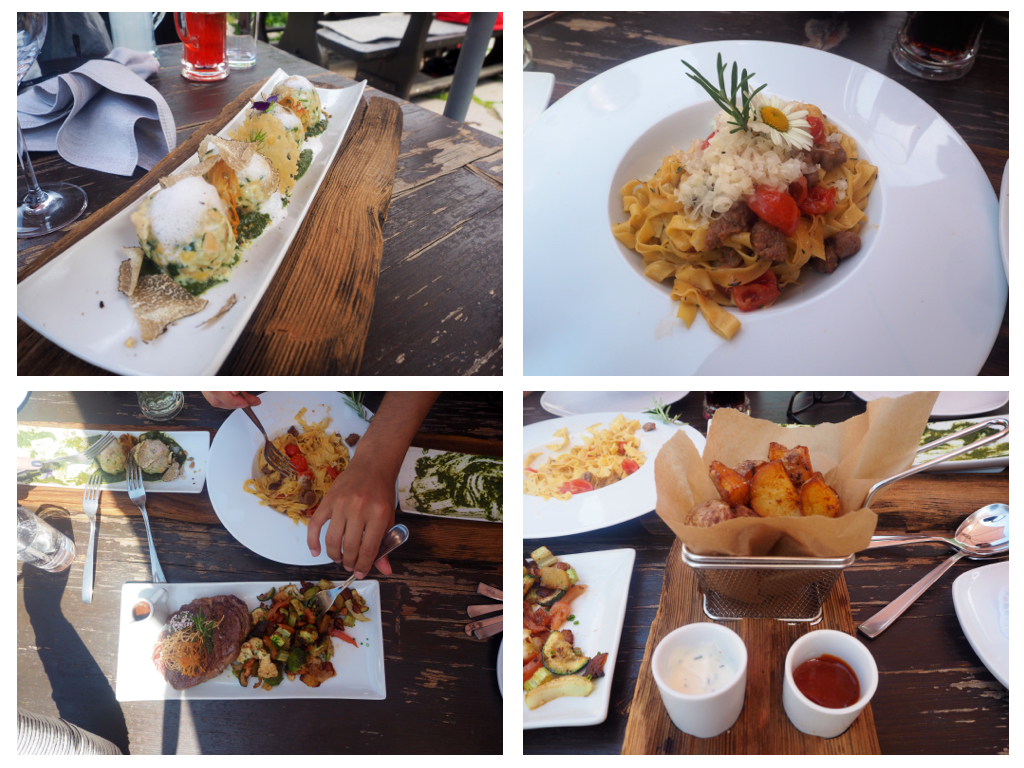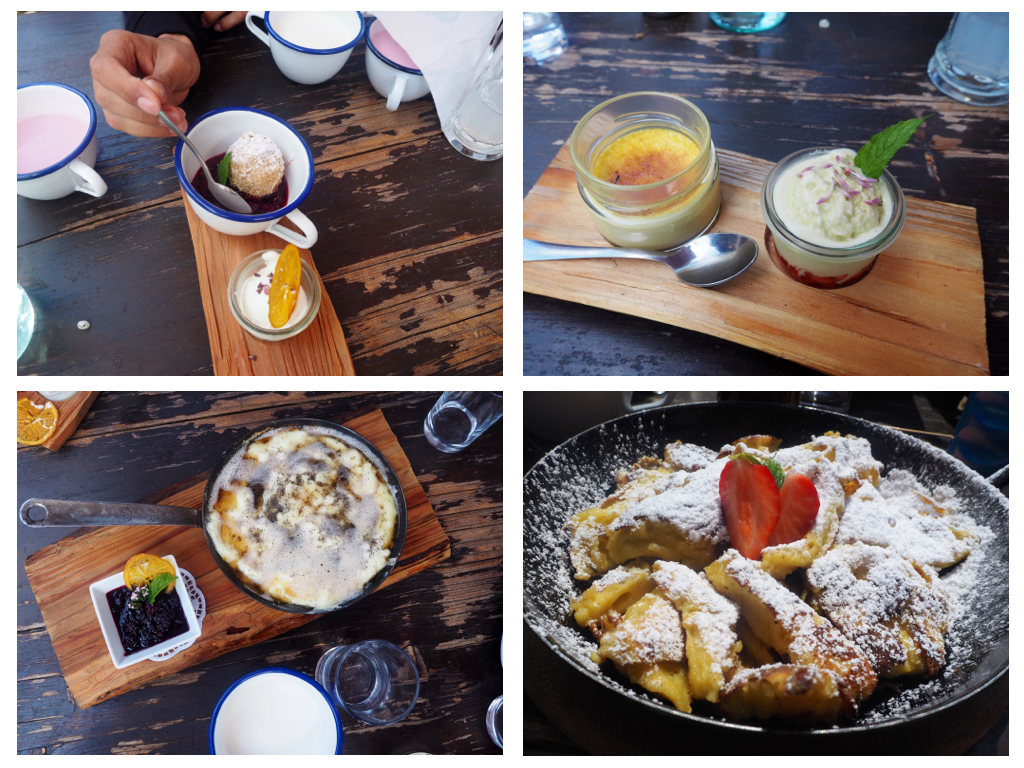 Als wir zu Tisch gerufen werden, staune ich nicht schlecht über die diversen Leckereien, die eins nach dem anderen zu unserem Tisch gebracht werden. In 1.800m, mit dem Kopf in den Wolken, muss sich tatsächlich der Food-Himmel befinden! Ob für Vegetarier oder Omnivoren ist für jeden etwas dabei und kein Wunsch bleibt offen. Besonders gefällt mir, dass Obst, Gemüse, Milchprodukte und Fleisch hauptsächlich vom Bauern oder aus dem Bioanbau bezogen werden und mit diesen Produkten die Gerichte in der Almküche täglich frisch zubereitet werden. Hier oben am Berg hat man noch ein Verständnis und einen echten Bezug zu Lebensmitteln und ihrer Verarbeitung. Das sieht nicht nur gut aus sondern schmeckt auch hervorragend! Meine Favoriten waren definitiv die getrüffelten Knödel, der himmlische Kaiserschmarren sowie die Crème Brûlée und die frische Buttermilch.